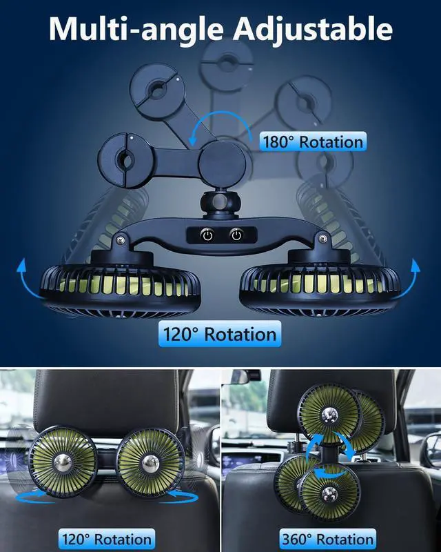 360° Adjustable The DICMKY dual head fan comes with a retractable arm that can be rotated and stretched any way you want, blowing on the rear passengers as well as bringing coolness to the front passengers at the same time.