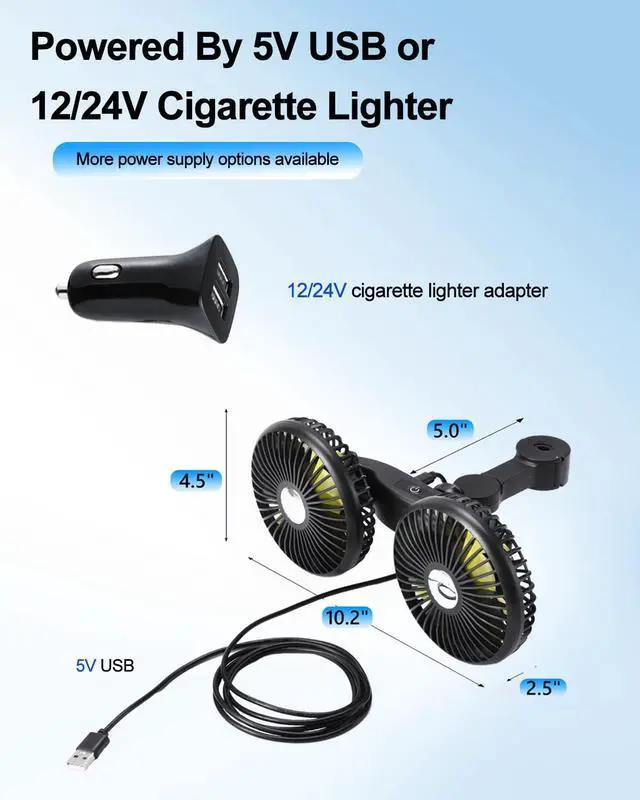 USB or Rechargeable Battery Operated The DICMKY dual head fan has a 2000 mAh battery that can last from 2.5/4.5/9 hours(Depending on speeds), also it can be used while charging. The 5V/2A USB powered auto fan is compatible with various devices, including power banks, car chargers, laptops, computers, and AC adapters. The car fan with extended 70 inches cord, is long enough to easily plug into USB devices