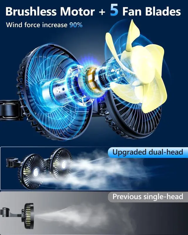 Double Coolness The DICMKY dual head car fans utilize 5-blade vortex type wind gathering technology to create a stronger and steadier stream of cool air. Powered by a brushless motor and the fan spindle is made of 100% pure copper, the mini fan for car delivers powerful and consistent airflow, maintaining noise levels under 30dB. Its quiet operation ensures minimal disturbance, making it ideal for long drives or road trips with family and friends in hot summer.