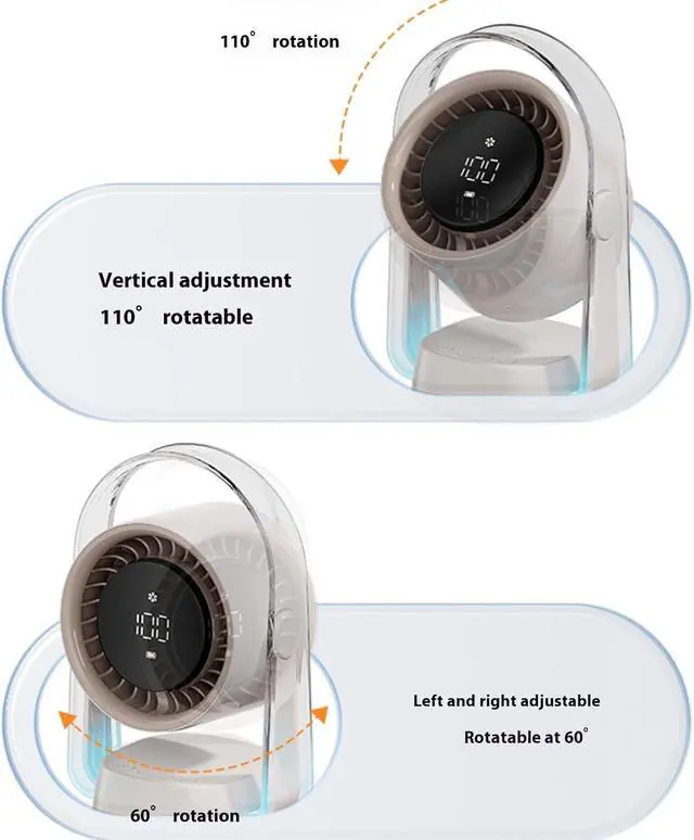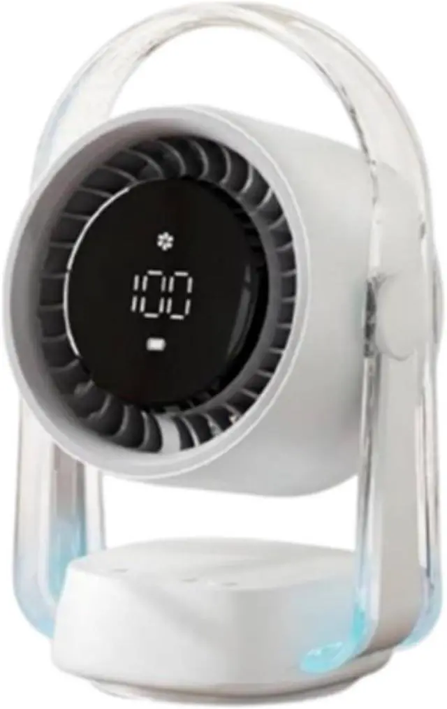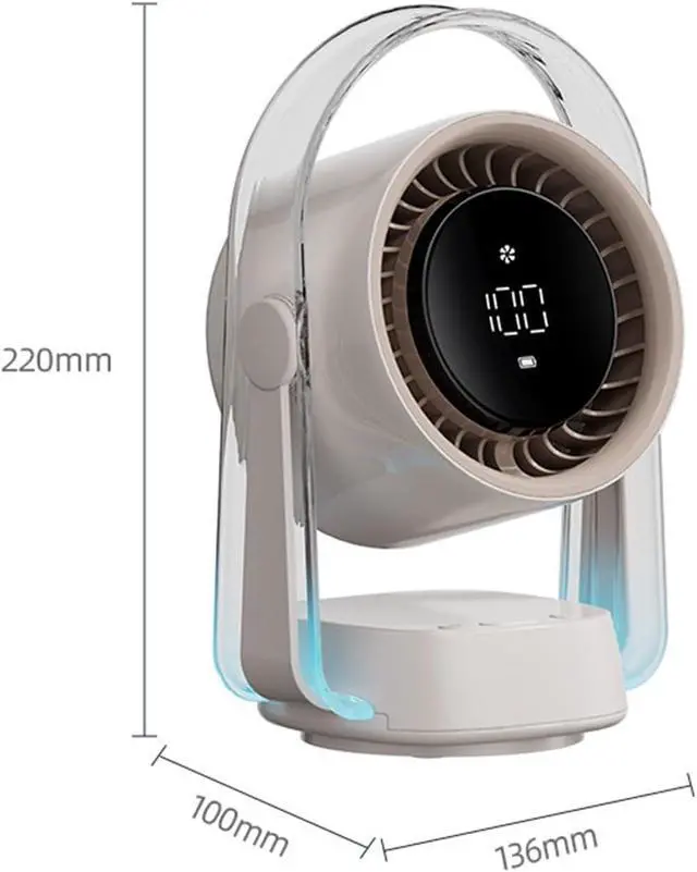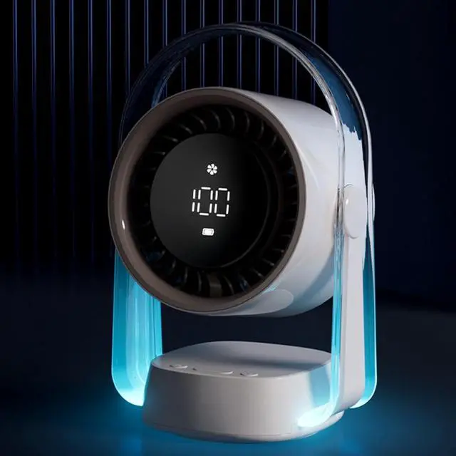 The rechargeable cooling fan boasts innovative double axises oscillation systems (up/down & left/right), builts in blue ambiances lighting, and a intelligent LED display showing real time setting, all housed in durability ABS/metal construction with 3500mAh battery for 8hour cordless operate