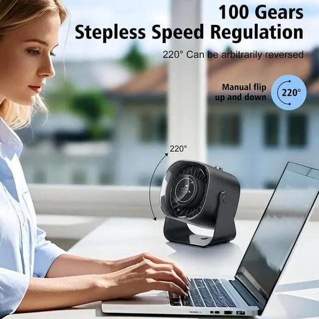 [Customizable 100-Speed Settings]: Tailor your cooling experience with 1-100 adjustable speeds. This fan offers a 220° manual tilt, versatile enough for desktop use or wall mounting, enhancing its portability and functionality.