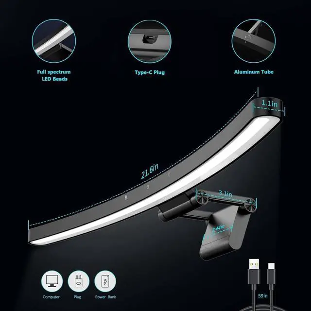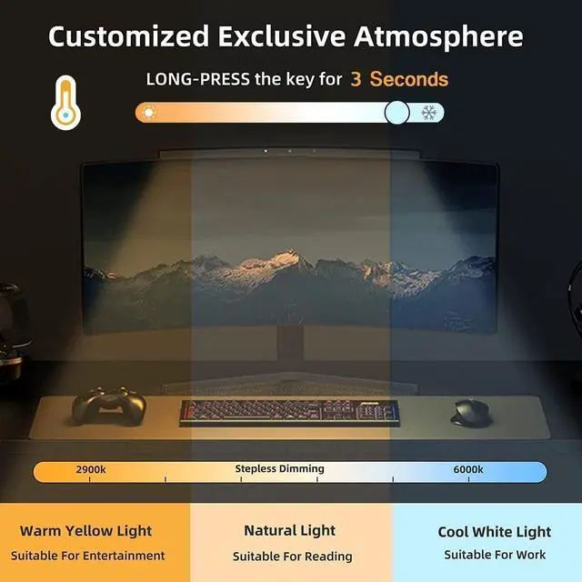 Infinitely Dimmable: You can switch the Computer Monitor Light Bar to warm light, cool light or natural light to increase concentration and comfort. Each color mode can be infinitely dimmed and controlled via the touch button to enhance your viewing experience for your daily computer tasks. Power-off memory design, automatic adjustment to the last set brightness and color temperature the next time you turn it on.