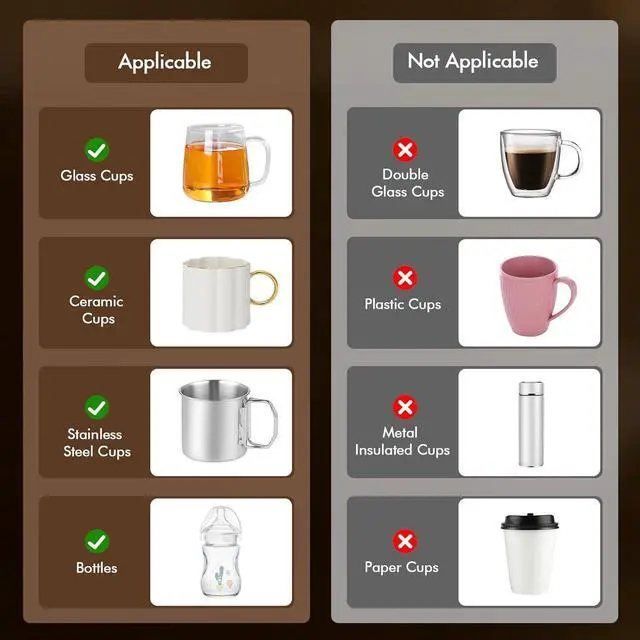 11.5 cm (4.5 inch) wide heating plate: compatible with most cups (ceramic, glass, stainless steel...). With a 1.5m cable, it is easy to use in the office or home. NOTE: Not compatible with double wall insulated cups