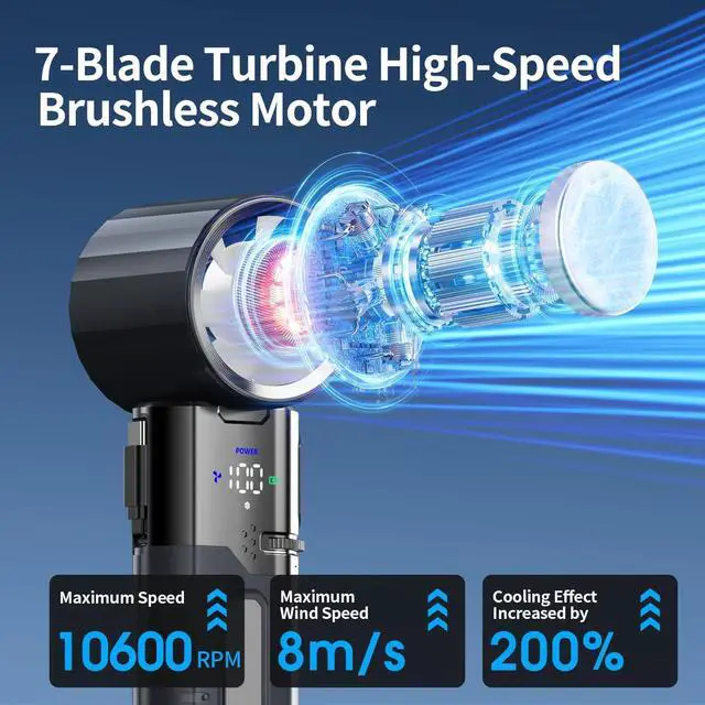 10,600 RPM Turbine Driven High-Speed AirflowThis portable fan rechargeable uses high-speed turbo fan technology with 7 blades to generate a powerful wind speed of 8m/s, covering a range of up to 2 meters, which is twice that of a standard blade fan. The penetrating airflow brings instant cooling, surpassing most handheld fan on the market.