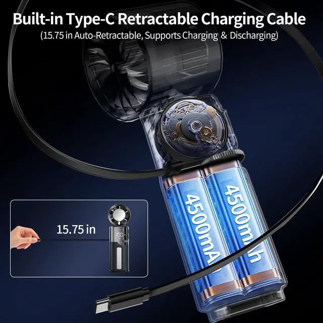Hidden Retractable Type-C CableThe built-in 14.96-inch retractable Type-C cable neatly stores inside the fan - simply pull to charge or retract. No need to carry an extra cable, easily connect anytime, anywhere. This cable also features reverse charging, so you only need a Type-C charging plug to charge the portable fan rechargeable.