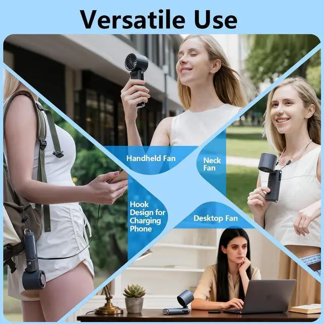 4-in-1 Multifunctional DesignThis multifunctional portable fan can be adjusted to a maximum tilt angle of 135°. It can be used as a desktop fan or hung around the neck with a rope as a neck fan, It can also be held in the hand as a handheld fan. It also comes with a keychain that can be hung on a backpack or used as a hanging fan. The versatile heat dissipation design is suitable for various scenarios, allowing you to experience coolness anytime, anywhere.