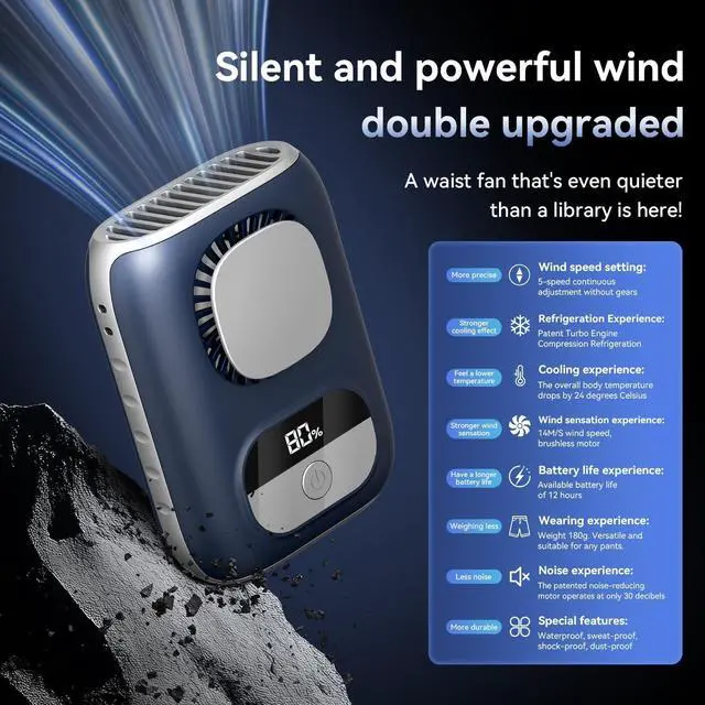 Intelligent Control & Quiet OperationFeatures 5-speed stepless speed change allowing free switching from a gentle breeze to strong cold wind to meet diverse needs The operating noise is as low as 30 decibels running quietly without disturbing work, study or daily conversations Equipped with an LED intelligent digital display showing wind speed gears and battery level clearly at a glance; the upgraded double-buckle design enables free switching of wearing positions between the front and back waist ensuring convenient and stable operation