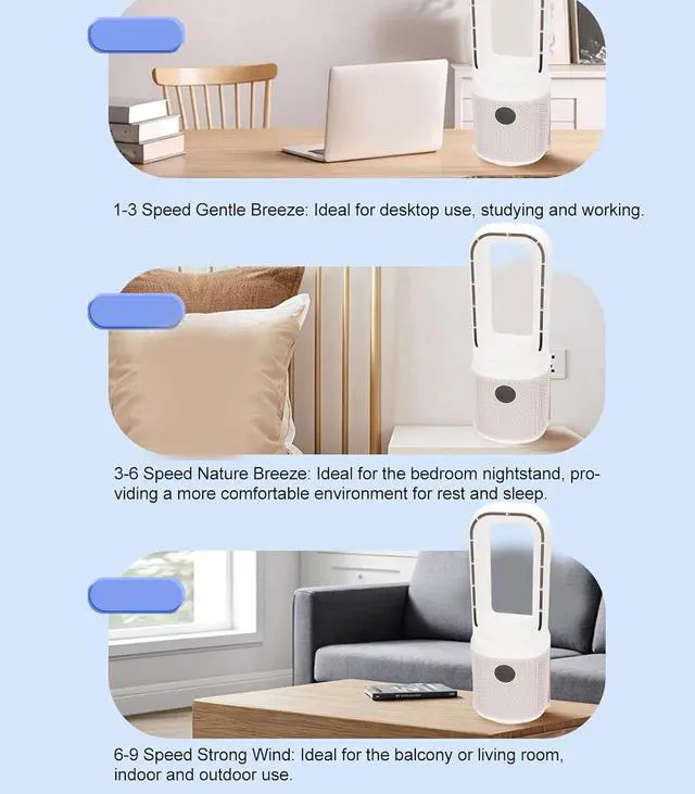 Enhanced Safety: This bladeless desk fan features a completely enclosed design without spinning blades, providing a safe environment for children and pets. The smooth surface allows for quick and simple cleaning with a soft cloth, maintaining a sleek appearance with minimal