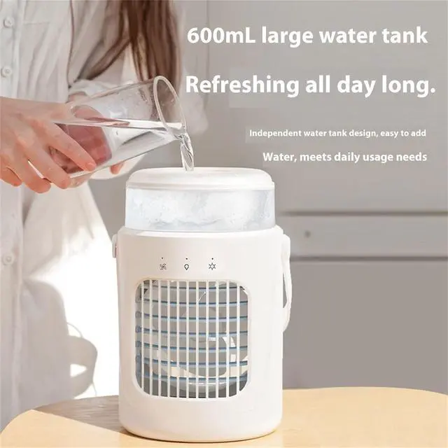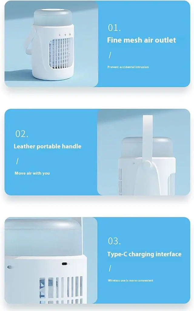 cooling relief with this portable air cooling device featuring mists and USB rechargeable design, combining evaporative cooling with humidification for enhanced comfort in dry, hot environments