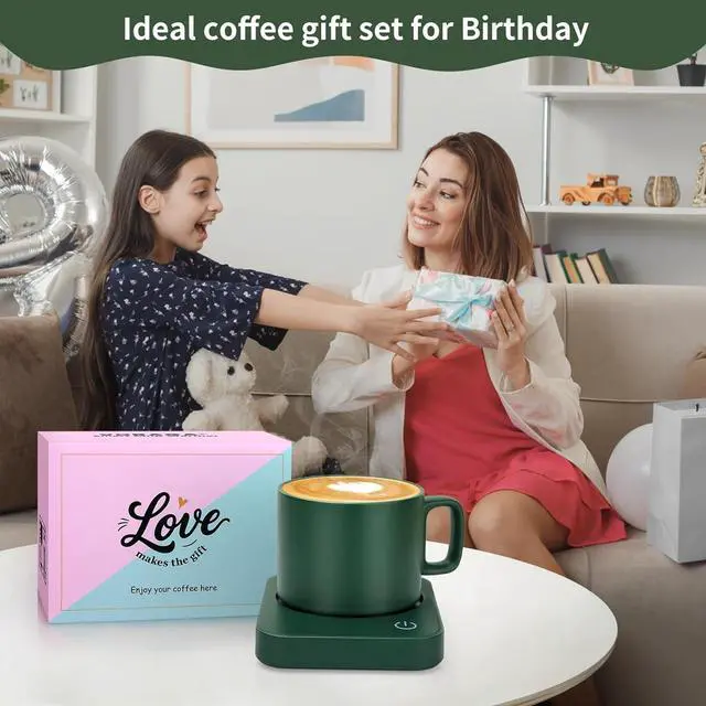 The Perfect Gift Set for Coffee Lovers: A ceramic mug paired with a green mug warmeran all-in-one solution to keep coffee temperature consistent from the first to last sip. Ideal for gifting to parents, coworkers, teachers, retiree, or anyone who craves a warm, flavorful sip anytime.