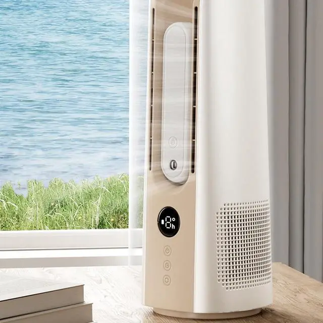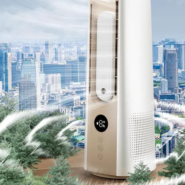 powerful cooling and humidification with our Twin cores Bladeless Fan,featuring double turbines for faster airflows and a misting function to combat dryness.
