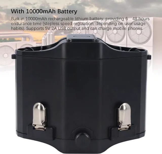 [LONG LASTING BATTERY LIFE] This portable waist clip fan is equipped with a built in 10000mAh rechargeable that provides an impressive 6 to 48 hours of continuous cooling depending on your usage habits. With stepless speed regulation you can adjust the fan speed to your preference ensuring optimal performance. Additionally the fan doubles as a power bank featuring a 5V 2A USB output to charge your mobile devices on the go making it for outdoor adventures.