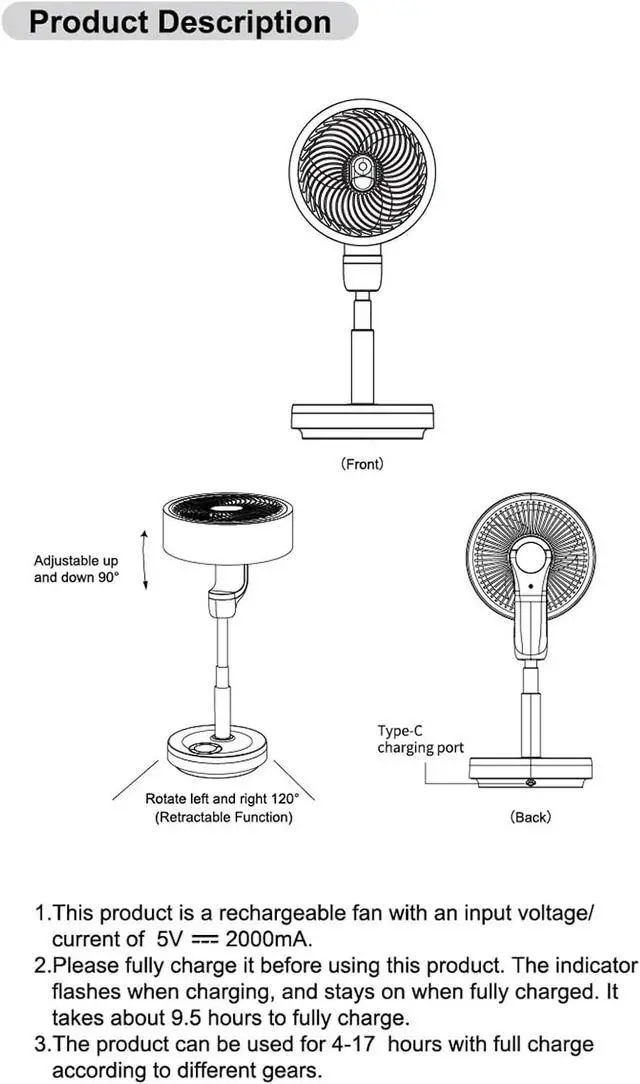 Multi-functional: Built-in 10,000 mAh rechargeable battery, 120 degree oscillation function, 4 speed adjustments, 1/2/3/4 hour timer function.