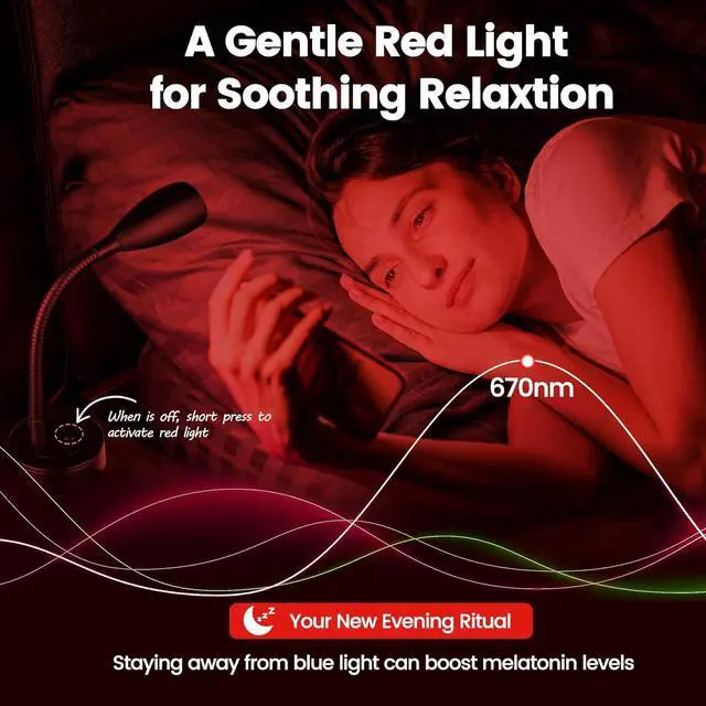 Red Light for Sleep: When your main light is off, simply long-press to activate a soothing 670nm red glow. This specialized technology eliminates sleep-disrupting blue light, supporting your body's natural melatonin production and circadian rhythm to help you drift off faster and achieve deeper, more restorative sleep.