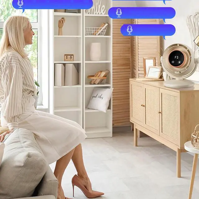 The ABS constructed air circulating fan combines voice recognition technology, manual adjustment, and noise reducing ducts to deliver quiet cooling.