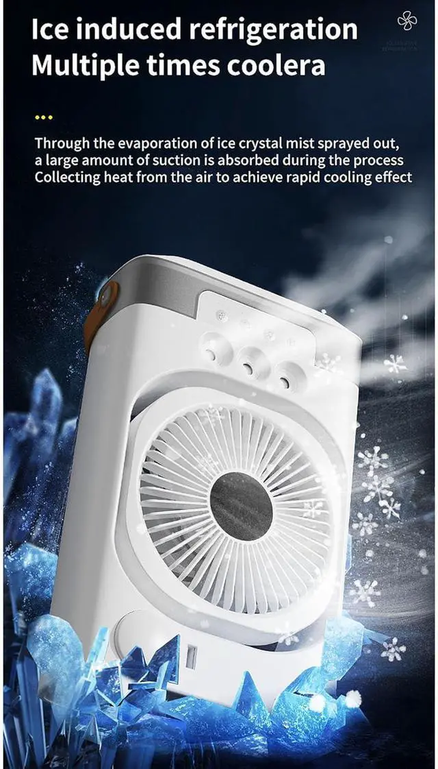 This portable mists fan combines cooling airflows, adjustable humidification, and colorful LED lighting in a small design with 3 speed modes and 120° directional control