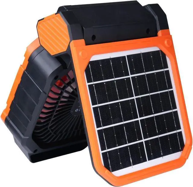 This solar/USB rechargeable portable fan allows you to charge your mobile device tablet with a 7800mAh battery, a portable fan with 4 speed air flow, and a cell phone tablet for outdoor activities and indoor comfort