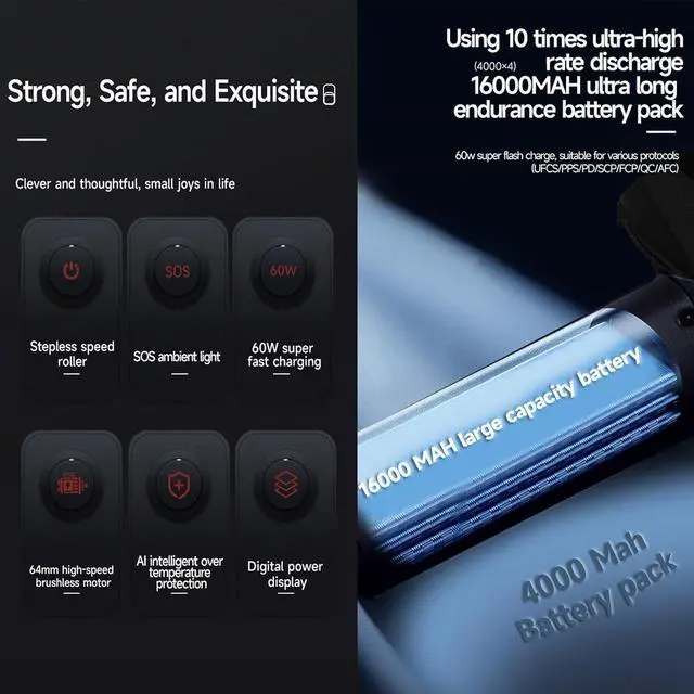 Battery Enhancement: Equipped with high rate discharge, 16000mah (4000x4) long battery pack, 60w fast charging, strong performances, with about 10 hours on full charging.