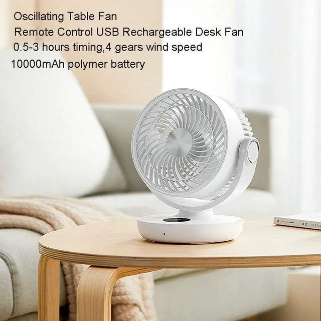 This fan is equipped with a remote control that can be operated from approximately 3 meters away. The stand/desk fan is powered by 10000mAh high capacity rechargeable battery, wireless 4.5-15 hours working time, 4 speed levels, operating time depends on speed