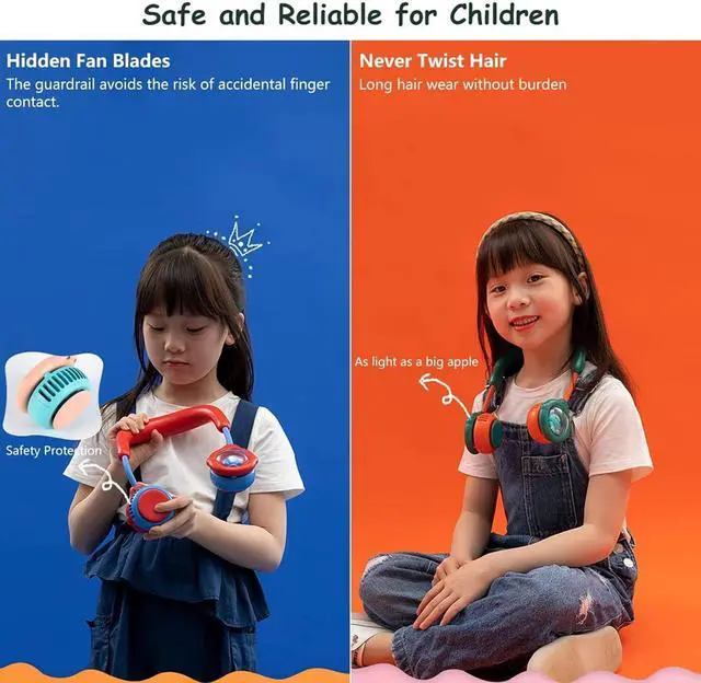 HANDS FREE FANS: This neck fan is made of high quality ABS, the smooth body hangs around your neck like a headset, it is safer for kids to play. Have your hands free and enjoy the air flow freely, perfect for indoor and outdoor activities.