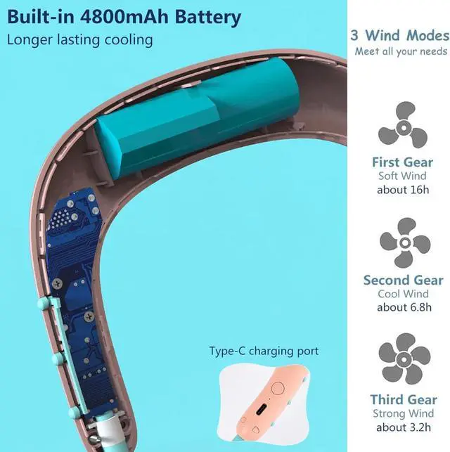 USB RECHARGEABLE: With a rechargeable 4800mAh Battery, the portable neck fan lasts 3.2 to 16 s depending on different speeds. The small personal fan can be charged by most computers, laptops, portable chargers and other devi