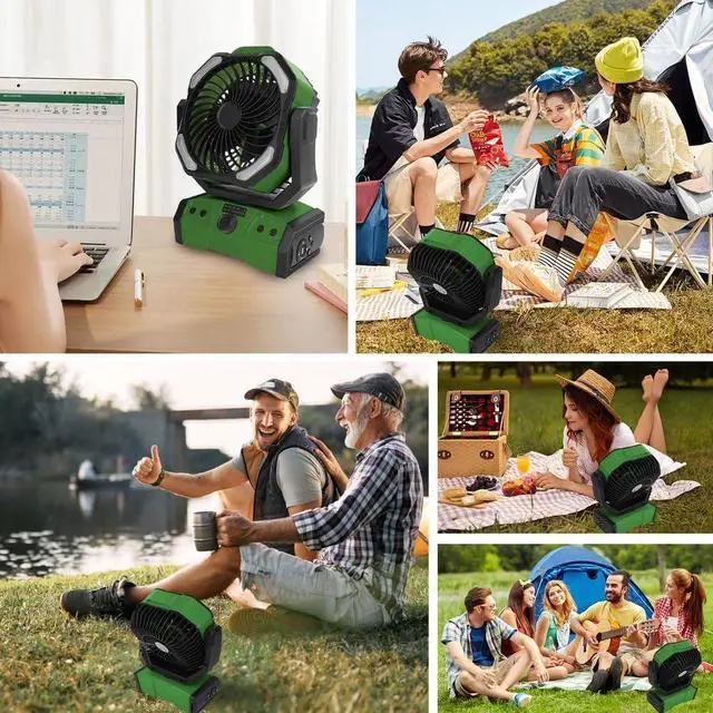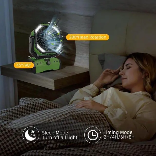 [30000mAh Rechargeable Battery]The camping fan has a built-in 30000mAh rechargeable battery, Built-in 5V/2A Type-C input port for charging the fan, as well as a 5V/2A USB output port for powering other devices; in addition, it supports working while charging, and will not get hot during use, which makes it a good helper for camping, travelling, blackouts, hurricanes, and picnics.