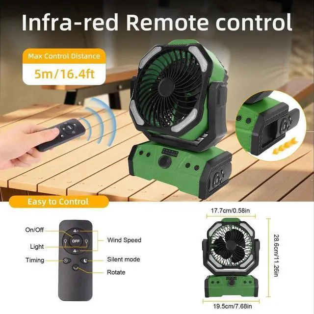 [Professional Camping Gear]We are equipped with a remote control for your convenience (distance not more than 5m) Also there is a 360° swivel table on the bottom and a foldable hook to hang the fan wherever you want. Press the oscillation button to choose between 45° or 90° automatic oscillation, and the 270° swivel head ensures that the fan blows in the direction you want.