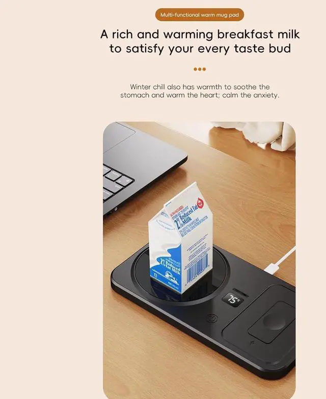 Versatile Desk Accessory: Designed with a slim flat base, the Coffee Warmer for Desk adapts to any tabletop environment, enabling users to enjoy simultaneous beverage warming and device charging through its double-zone operating, perfect for organized and functional desk setups