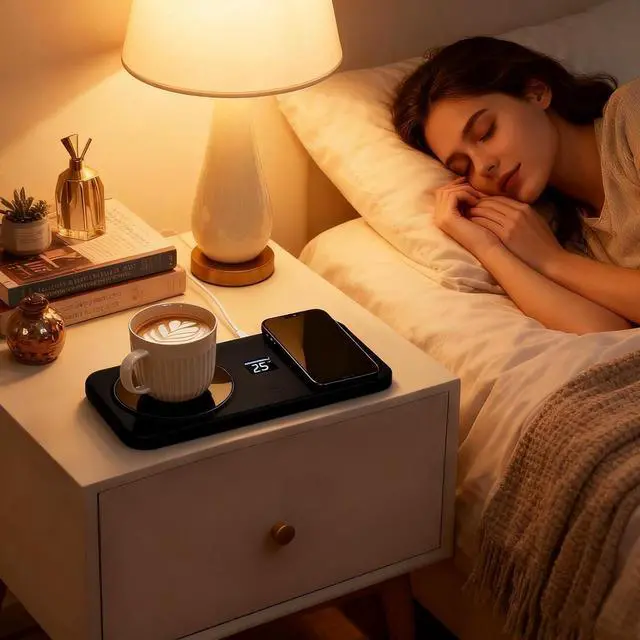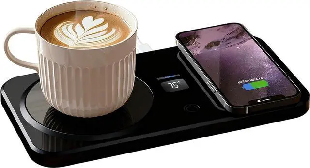 Wireless Charging Integration: The mug warmer supports wireless charging for phones and watches, reducing cable clutter while keeping your beverages warm, making it ideal for desks and bedside use, enhancing convenience in daily routines