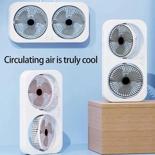 powerful cooling with this double head desk fan featuring rotating for directional airflows, offering flexible wall mounted or freestanding placement in any room.
