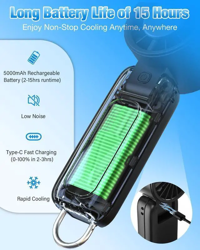 The personal fan features a 5000mAh rechargeable battery, fully charged up to a long battery life of 2-15 hours (depending on different speeds). Fast Type-C Charging, fully powered in just 2-3 hours and Works with laptops, cars, power banks, and USB outlets, that can be charged anytime, anywhere.