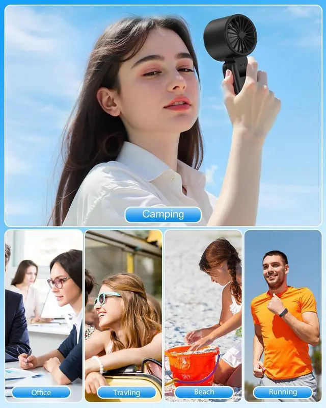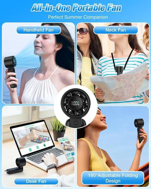 The portable fan with strong wind and stylish appearance, 4-in-1 usage mode (handheld/desktop/neck/backpack suspension), becomes an all-around cooling companion for office, outdoor sports, camping, gym, school, home life, etc.