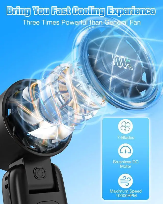 Our handheld fan can quickly bring you a cool experience like natural wind. The combination of a brushless motor and an exclusive 7-blades design improves the wind speed, the handheld turbo fan delivers 3x more airflow than ordinary fans, reaching 10,000 RPM, instantly delivering storm-level cooling