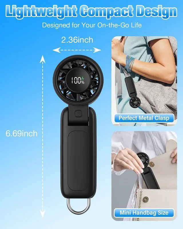 This portable travel fan features a clear digital display that shows real-time wind speed settings and remaining battery life. You can adjust the wind speed according to your needs, when the battery runs low