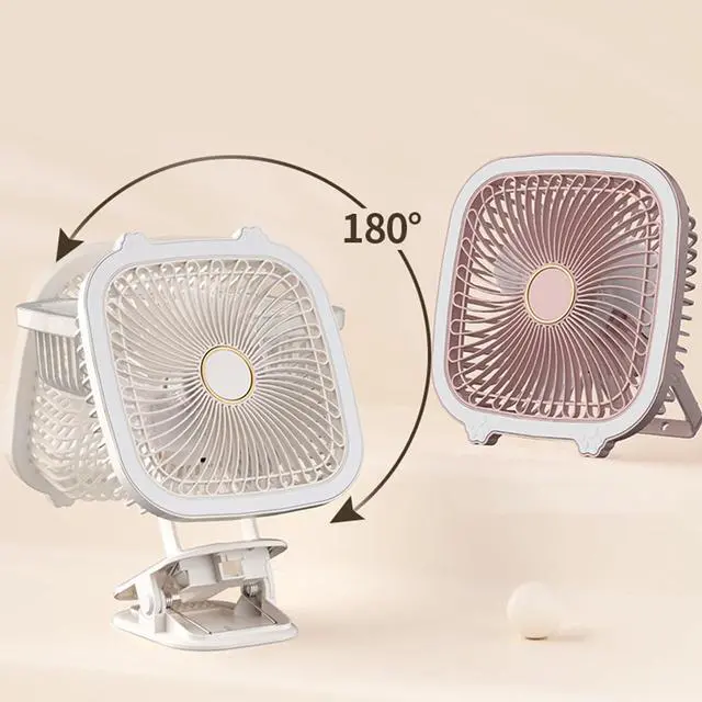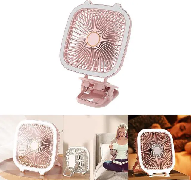 Made of durable plastic, this fan features a 1200mAh battery capacity, 3 wind speeds, 1 brightness level, and a versatile design that can be used as a clip-on fan, hanging fan or desktop fan with built-in fan. In the light
