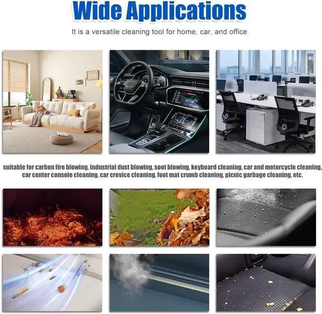 Wide Applications:It is a versatile cleaning tool for home, car, and office, suitable for carbon fire blowing, industrial blowing, soot blowing, keyboard cleaning, car and motorcycle cleaning, car center console cleaning, car crevice cleaning, foot mat crumb cleaning, picnic garbage cleaning, etc.