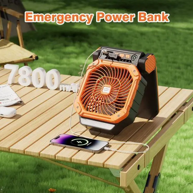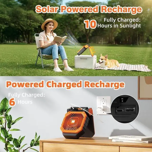 Multiple Charging Options: During the day, solar powered fan automatically absorbs sunlight through the 4W solar panel and converts it into electricity. On sunny days, it can be fully charged in just 2 hours. In cloudy or rainy weather, or when used indoors, it can be quickly charged via the USB-C port, taking only 6 hours for a full charge. Equipped with a high-capacity 7800mAh battery and multiple wind speed settings, the battery powered fan lets you enjoy cool breezes anytime.