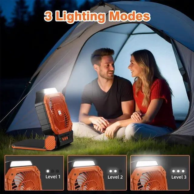 3 Brightness Levels: Solar powered fan is equipped with 8 LED light beads and offers 3 adjustable brightness levels. In low mode, it can run continuously for up to 100 hours, while high mode provides up to 18 hours of illumination. The LED is light soft and non-glaring, with an independent switch for lighting control to meet different lighting needs. The outdoor fan is perfect for staying cool in the evening or during outdoor activities, offering a convenient and versatile experience.
