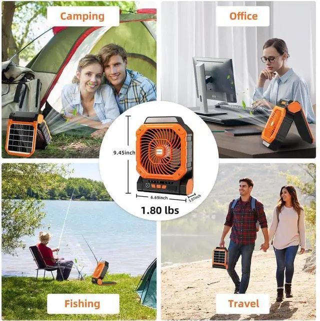 Lightweight & Portable: Solar powered fan features a portable foldable design and weighs only 1.80 pounds. Its collapsible structure saves space and allows for quick setup and easy storage without taking up much room. The portable fan operates quietly, delivering continuous cool airflowperfect for outdoor activities during hot summer days. Camping fan made from impact-resistant ABS material, it's an essential portable cooling companion for outdoor enthusiasts.