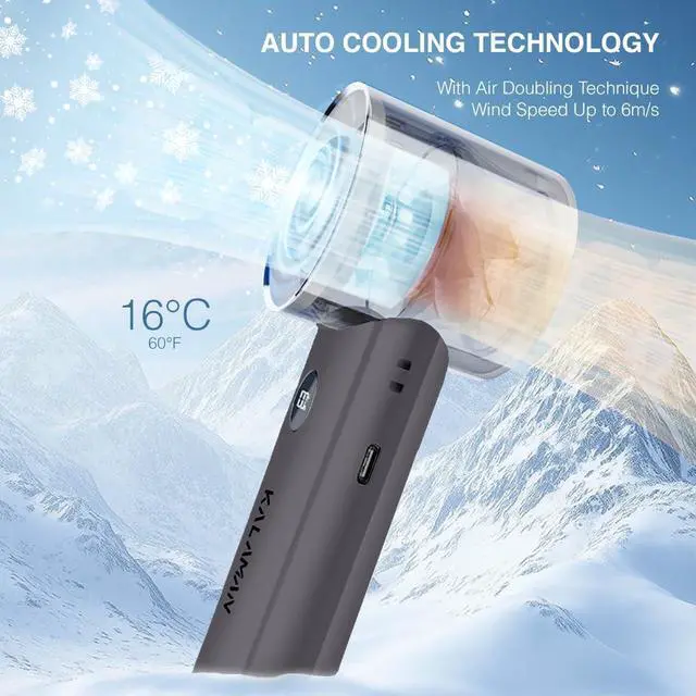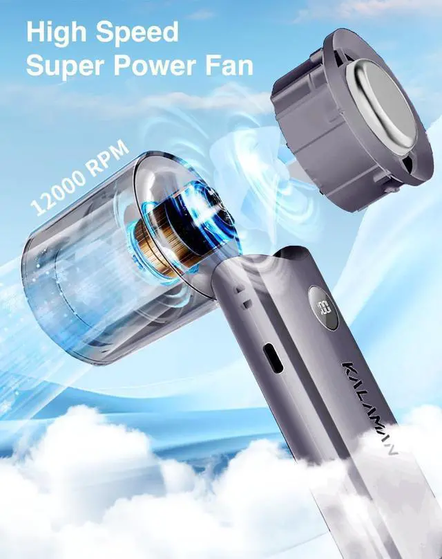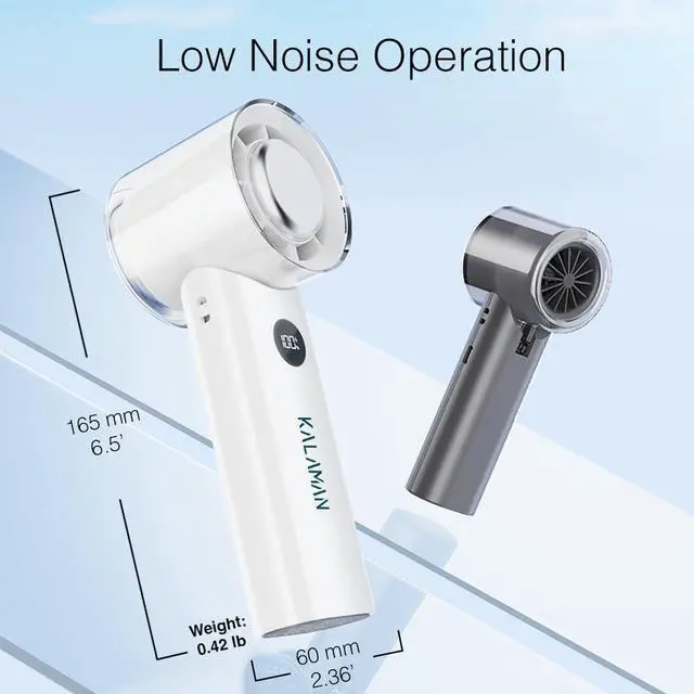 KALAMAN Ultra-Fast Cooling: Features an advanced 5-blade design paired with a high-speed three-phase brushless motor, delivering a maximum wind speed of 6.5m/s faster than traditional hand held fans! With a 12000 rpm maximum speed, it instantly blows away the heat, keeping you cool and comfortable all day long