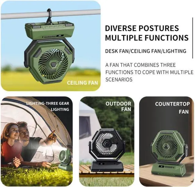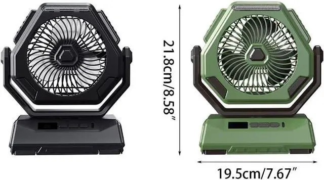 Hook allows you to hanging the portable fan on the tent, inside a car; and fan base also act as desk fan, table fan, office fan, bedroom fan, beach fan, indoor fan.