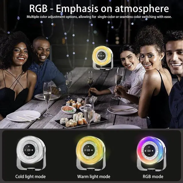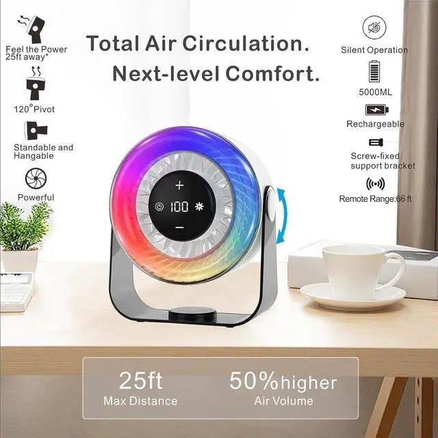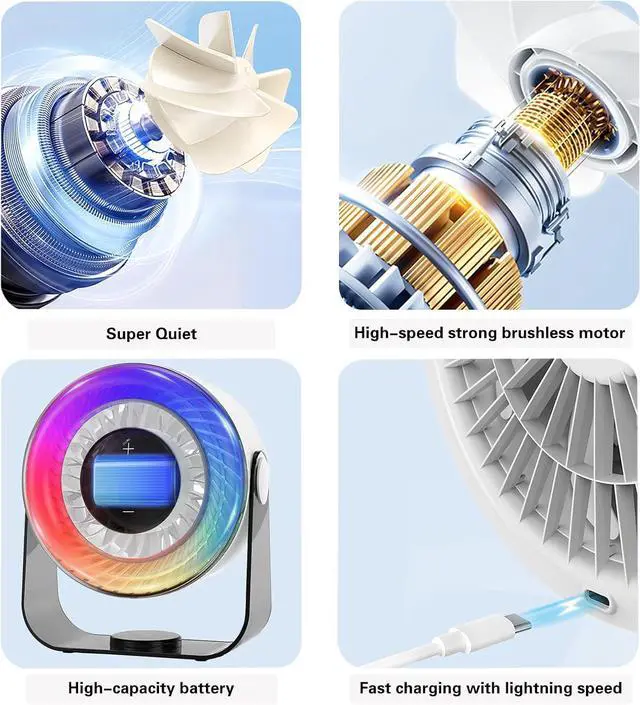 Color Changing Led LightLong press the table fan light button to turn on or off the ambient light, and short press to switch between 3 lighting modes.It has a built-in warm white light,white light and colorful gradient light to create a personalized atmosphere