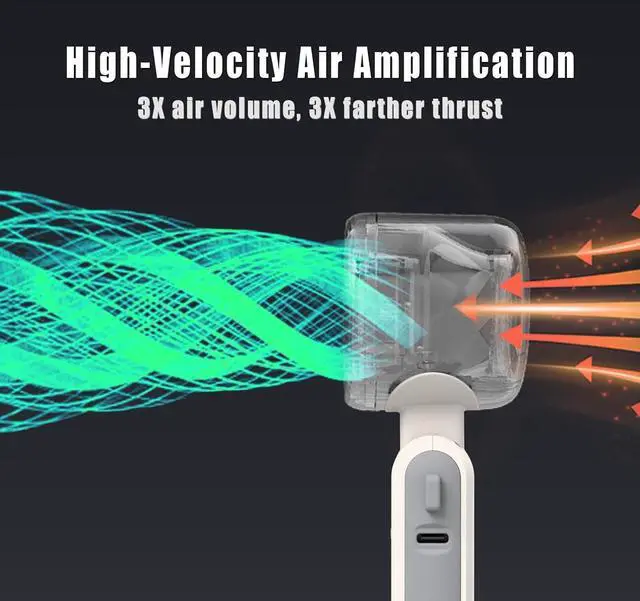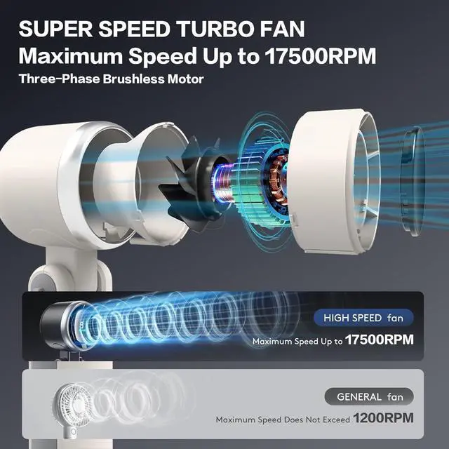 Portable Turbo Handheld Fan/ 3-Phase Brushless Motor 6-Blade Turbo Cooling: 3-phase brushless motor & turbine design deliver 10m/s hurricane-force wind (tested) - perfect as a makeup fan handheld or travel fan 17,000 RPM Power: Cools 35% faster than standard handheld fans - drops temps 3 sec in 40/104 heat 3-in-1 Portable Fan: Converts handheld/neckband/desktop Pro-Grade Airflow: Multi-stage pressurized system moves 40% more air than other rechargeable fan small options