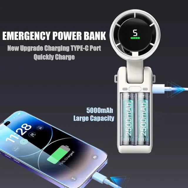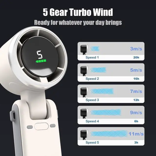 5-Speed Handheld Turbo Fan | 5000mAh 20H Runtime 5-Gear Precision Control: Natural/Slow/Medium/Fast/Super Fast modes for customized cooling - a must-have travel essential 5000mAh Handheld Fan Rechargeable: Enjoy 20hrs continuous use on single charge (2.5hrs USB-C fast charge) Engineered Airflow: Mini portable fan with upgraded turbo blades deliver 20% stronger wind than competitors One-Button Smart: Cycle through speeds with single power button on this fan portable powerhouse