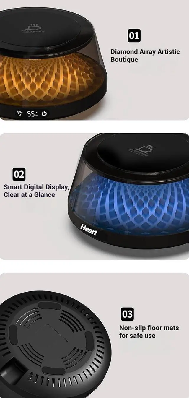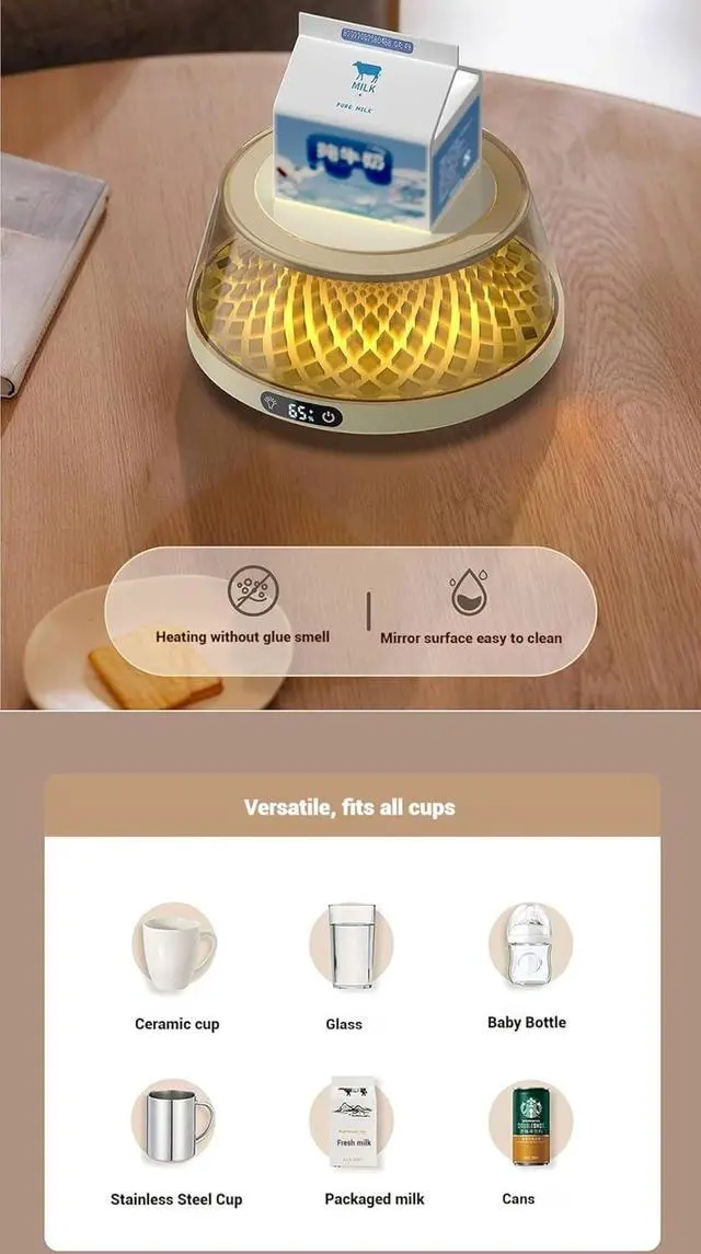 Compatible ceramic, glass, mugs. Operates silently during heating, for work, study, or relaxation in diverse settings