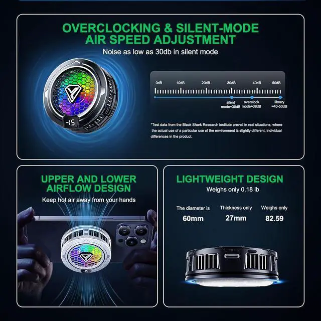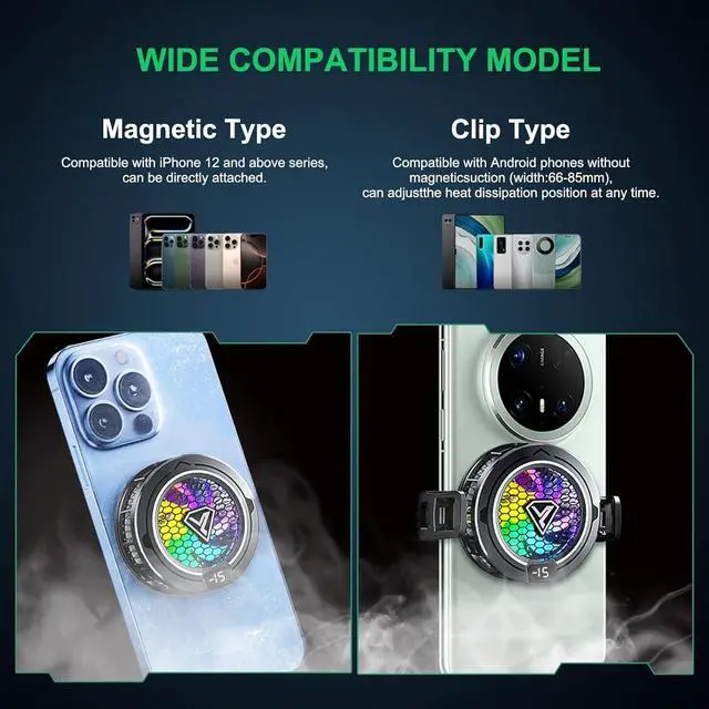 The advanced phone cooling fan utilizes semiconductor cooling technology and a custom TEC chip to effectively tackle overheating during wireless charging, ensuring optimal performance even under heavy use. Compatible with various iPhone and tablet models, it includes a magnetic attachment and clip for devices without magnetic charging. The phone fan offers two speed setting Specifications