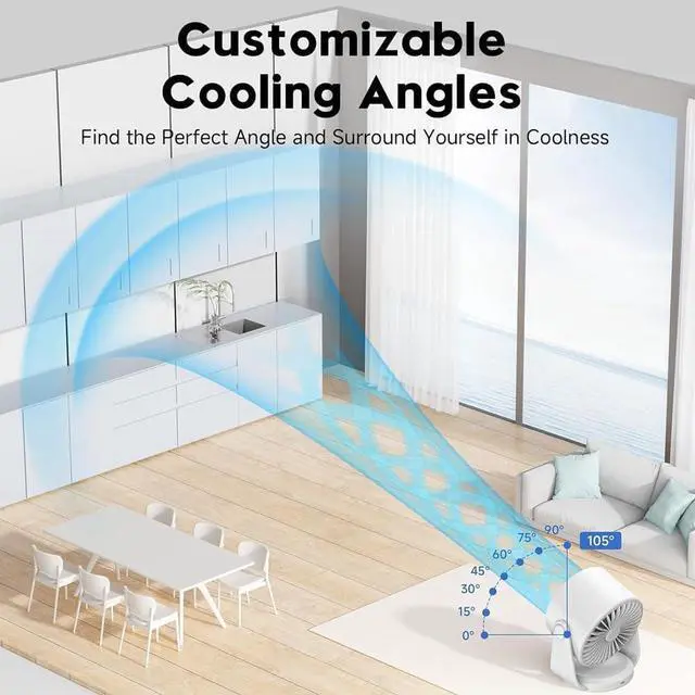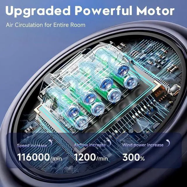 [Super Powerful Cool Fan] - Driven by a state-of-the-art wind power motor fused with the latest AI chip, this table fan . Its speed peaks at 116000/min, airflow jumps by 1200/min, and wind power soars 300%, propelling air with might. The four-blade circulating air ducts work efficiently to cool fast. Moreover, with a 105° adjustable angle, this fan caters to your relaxation needs, whether you're unwinding after a long day or taking a break, being your reliable cool partner all season