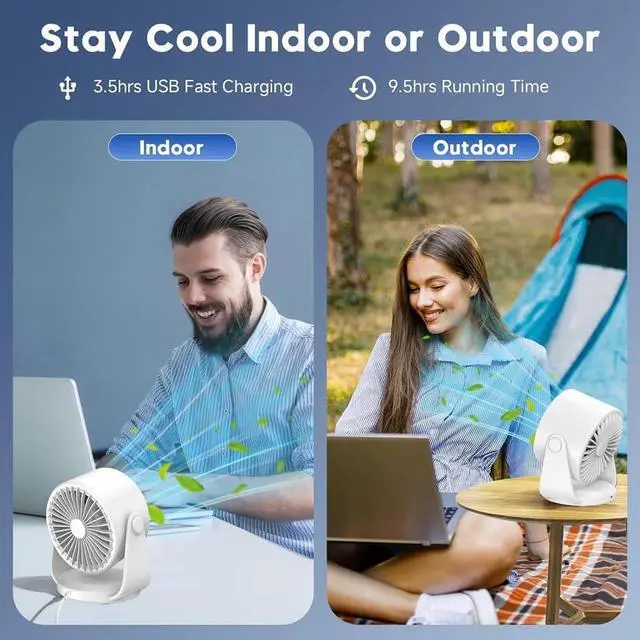 [Cooling in 3 Seconds]- Designed in cooling wind, this fan could cool in 3 seconds(16°)and enable you to instantly feel the gentle breeze in the sweltering summer days. What's more, the personal fan has a built-in 4000 mAh battery with a charging time of about 3.5 hours for 3-10 hours of continuous operation and supports wireless fan use in extremely hot and no AC power. Even in the hot air, you can live comfortably