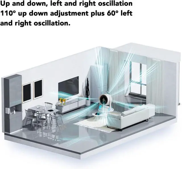 Powerful Cooling: Driven by a strong wind power motor and enhanced by the latest AI chip, the desk fan delivers outstanding performance with wind speeds reaching 6.2 m/s, increasing air power by 300%. The 7 blades design operates efficiently, quickly cooling your space. Additionally, it features an adjustable angle of up to 110° and an automatic oscillation function that rotates left and right by 60°.