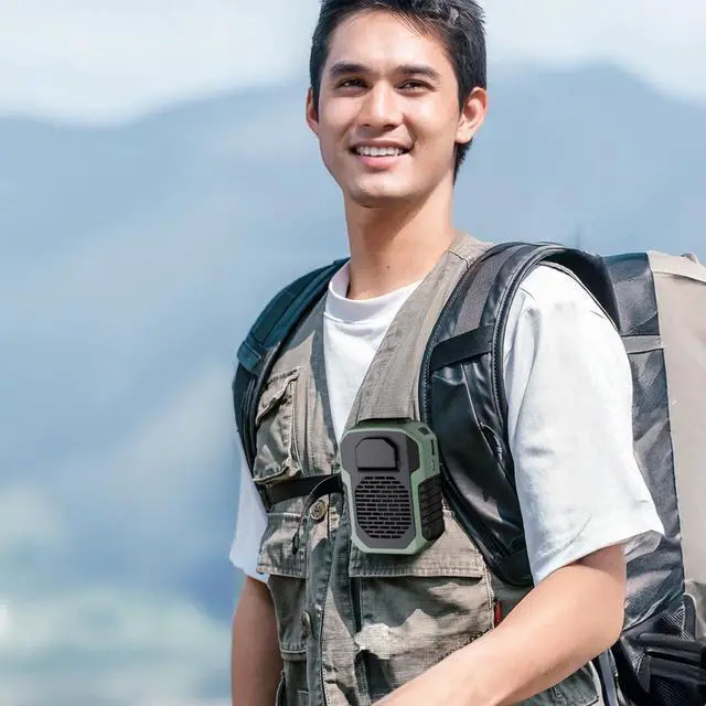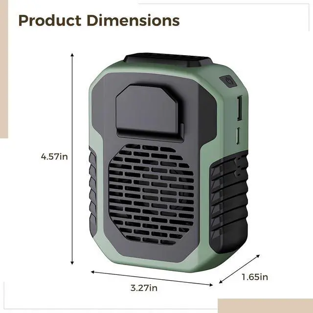 Color:Green Material:Plastic Product Size: 4.57 in x 3.27 in x 1.65 in / 11.6 cm x 8.3 cm x 4.2 cm Package Includes:Neck fan*1, type-c charging cable*1, lanyard*1, Chinese and English manual*1 Note: - Please refer to the measurement. Tiny measuring error is allowable in normal range. - There might be a little color difference due to the monitor, camera or other factors, please refer to the physical item.